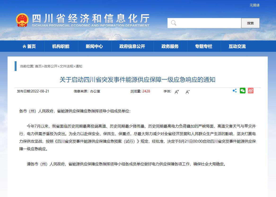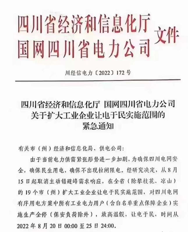 近期,因極端高溫天氣等原因,四川工業(yè)企業(yè)“臨時限電通產(chǎn)”引發(fā)行業(yè)高度重視。此前,相關(guān)部門下發(fā)通知,將限電停電期定為8月15日至20日。不過由于高溫天氣并未得到明顯好轉(zhuǎn),電力供需緊張形勢進(jìn)一步加劇,8月20日四川經(jīng)信廳、國網(wǎng)四川電力公司發(fā)布的一份《關(guān)于擴大工業(yè)企業(yè)讓電于民實施范圍的緊急通知》,將限電期限延長至25日,使得限電總時長延長到11天.