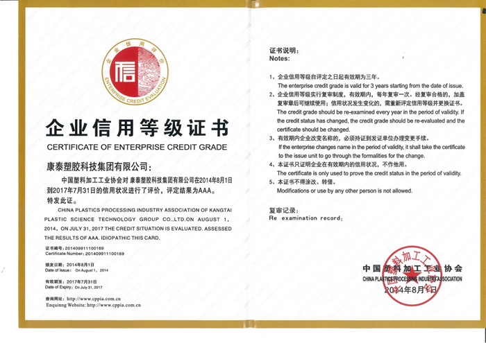 本報(bào)訊 在中國(guó)塑料加工工業(yè)協(xié)會(huì)2014-2017年度企業(yè)信用等級(jí)評(píng)級(jí)活動(dòng)中,經(jīng)中國(guó)塑料加工工業(yè)協(xié)會(huì)審核批準(zhǔn),康泰集團(tuán)在信用狀況進(jìn)行了評(píng)價(jià),獲得了AAA級(jí)榮譽(yù)證書。公司榮獲此項(xiàng)殊榮,是公司始終堅(jiān)持“立足誠(chéng)信,科學(xué)管理”的經(jīng)營(yíng)理念所取得的成果。